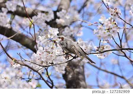 桜の花の蜜を吸うヒヨドリ