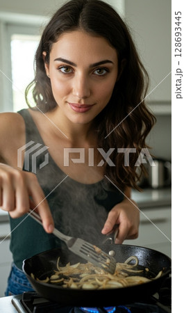ガスコンロでフライパン調理するシェフの女性(手元)