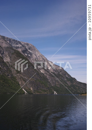 ノルウェー フロム~グドヴァンゲン間のソグネフィヨルド・クルーズの観光船からのフィヨルドの山の風景。