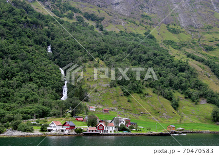 ノルウェー フロム~グドヴァンゲン間のソグネフィヨルド・クルーズで滝や集落の建物などの風景を楽しむ