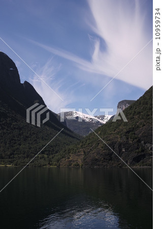 ノルウェー フロム~グドヴァンゲン間のソグネフィヨルド・クルーズ観光船から見る大きな雲と雄大な風景。