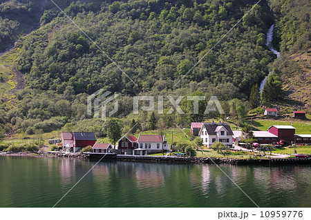 ノルウェー フロム~グドヴァンゲン間のソグネフィヨルド・クルーズ観光船から谷あいの集落を見る。