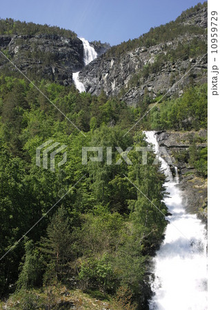 ノルウェー フロム~グドヴァンゲン間のソグネフィヨルド・クルーズの観光船からフィヨルドの山と滝の風景