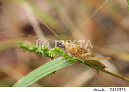 生き物 昆虫 クビキリギス、褐色型の個体。枯れた草むらに溶け込むカモフラージュ