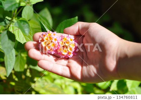 pick the flowers or Lantana camara L, Cloth of gold or Hedge flower or Lantana or Weeping lantana or White sage or VERBENACEAE or pink flower
