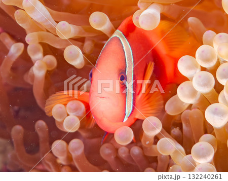 美しいイソギンチャク畑の可愛いクマノミ(クマノミ亜科)の幼魚。 静岡県伊豆半島南伊豆町中木ヒリゾ浜