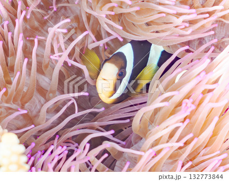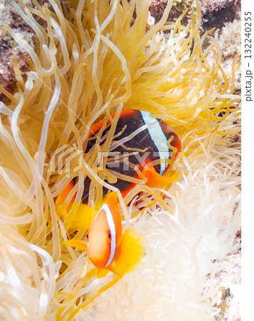 可愛いクマノミの一家。美しいサンゴ礁と熱帯魚の群れ。 沖縄県島尻郡慶良間諸島座間味島安室島-2025
