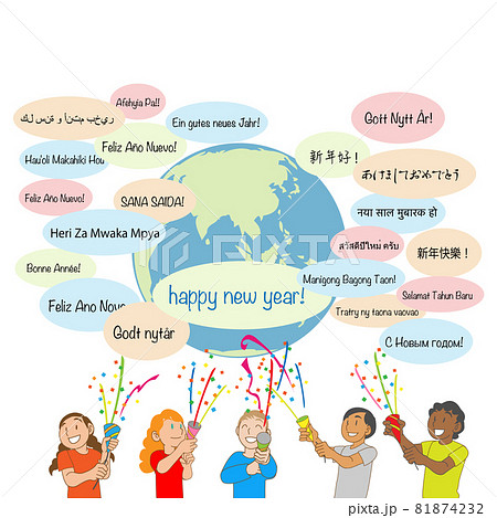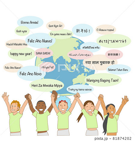 各国の言葉で新年を喜ぶ多民族の子供たち