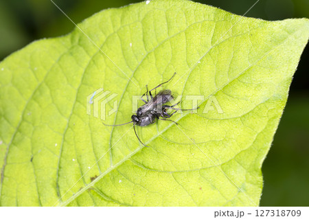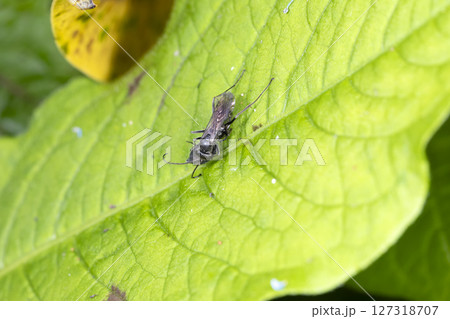 つる性植物の葉にベッコウクモバチ成虫(アウトドアフィールド昆虫マクロ撮影)