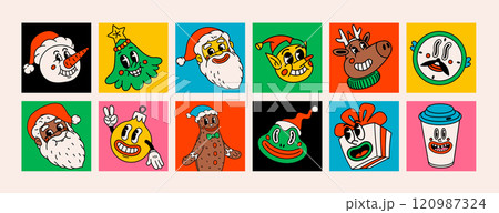 Retro style Christmas mini cards or stickers with groovy Christmas characters and objects. Ideal for Christmas and New Year sticker designs and decorations, vector illustration