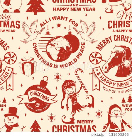 Merry Christmas and Happy New Year seamless pattern or background. stamp, sticker set with trees, Santa and Elf. Vector. Vintage wallpaper for xmas with new year emblem in retro style