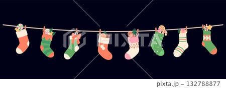 Christmas socks on rope. Fabric cotton wool sock with different gifts and sweets. Winter holidays decoration elements, candies and plants, vector design