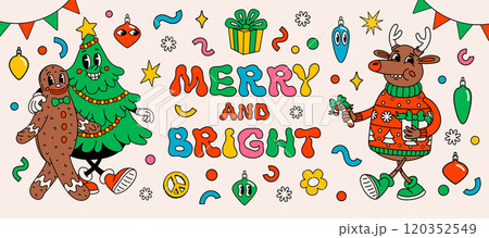 Groovy merry and bright christmas stickers with deer, Christmas tree, gingerbread man, gift, and other design elements in retro vintage cartoon style