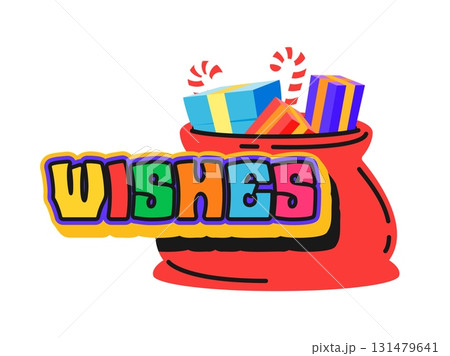 Christmas wishes Y2K funky sticker or symbol. Winter holiday festive Y2K label, New Year celebration vector sticker. Christmas patch with Santa bag or sack full of gift boxes, colorful typography