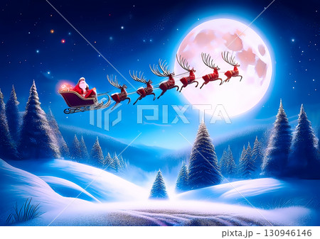 星空を飛ぶトナカイのソリに乗ったサンタクロースの3dイラスト