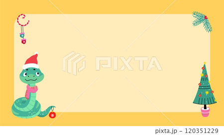 New year snake banner. Cute snake in santa claus hat, xmas tree and decorations. Template for children diploma, postcard, ad poster, vector design