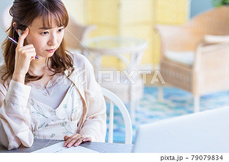 自宅のリビングルームでリモートワークをしている女性