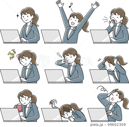 パソコンに向かって仕事をするビジネスウーマンの表情セット