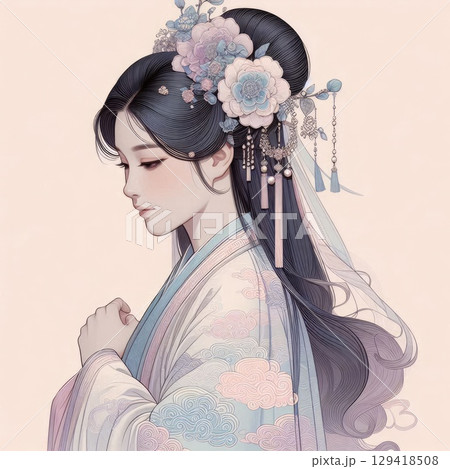 Elegant Traditional Chinese Woman in Delicate with Floral Hair Ornaments with Generative AI.