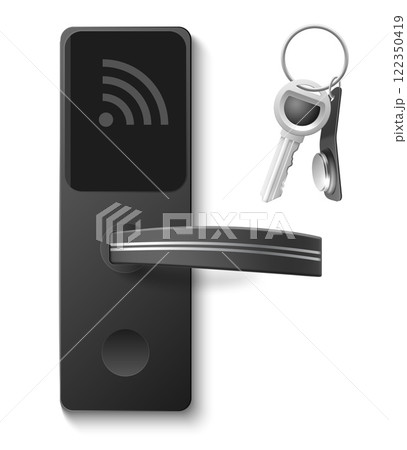 Smart door lock with smart key. Realistic isolated entry knob element. Wi fi technology, home, office or hotel metallic doorway, elegant furniture. Safety room protection. Vector concept