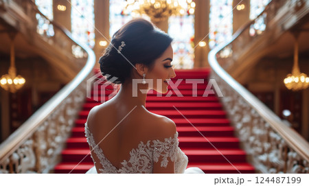 赤い階段に立つウェディングドレス姿の花嫁の横顔