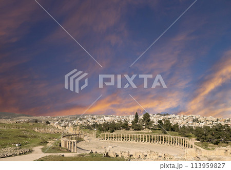 Roman ruins (against the background of a beautiful sky with clouds) in the Jordanian city of Jerash (Gerasa of Antiquity), capital and largest city of Jerash Governorate, Jordan