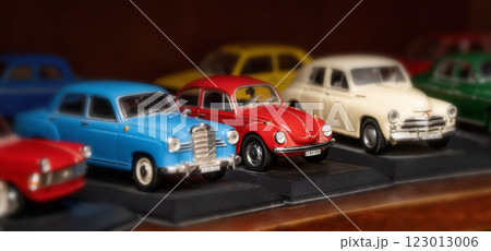 Collection of colorful miniature vintage cars displayed on wooden shelf