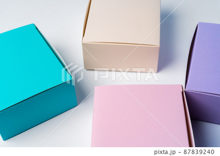 Pile of colorful cardboard boxes on white background