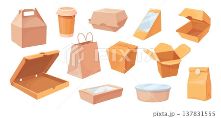 Delivery cardboard bags. Takeaway food box, paper bag burger sandwich snack plastic craft package coffee cup pizza takeout lunch boxes containers cartoon neat vector illustration