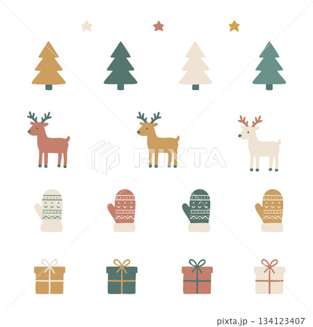 手描きの北欧クリスマスベクター要素セット:トナカイ、ツリー、ミトン、ギフト、星のアイコン:350dp