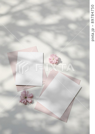 Wedding still life. Feminine spring breakfast scene. Pink Japanese cherry tree, sakura blossoms in sunlight. Blank greeting card, invitation. Blush pink envelopes. White dappled table background