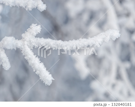 Tree branches in winter covered with snow and frost in snowfall. Frozen tree branches.