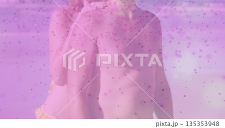 Embracing pair wearing dark swim trunks and yellow bikini bottom at beach shoreline, pink overlay