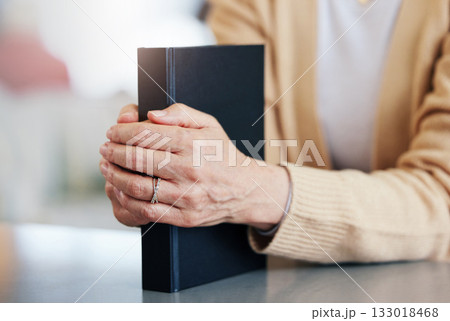 Bible book, praying or hands of old woman for holy prayer, support or hope in Christianity or faith. Believe, zoom or catholic senior person studying or learning God in spiritual text in religion
