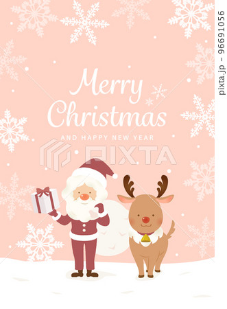 クリスマス 雪原のサンタクロースとトナカイのフレーム背景 ピンク