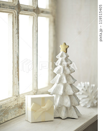 明るい窓辺に飾り付けられたクリスマスイメージ
