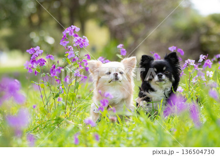 花咲く季節に並ぶ愛らしいチワワ