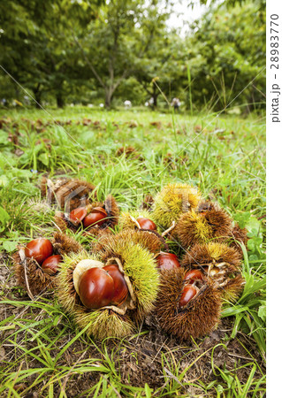 地面に落ちた裂開したイガグリを見るクリ畑風景
