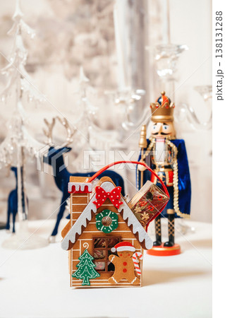 Whimsical Gingerbread House And Nutcracker With Icing Details And Candy Accents, Miniature Reindeer