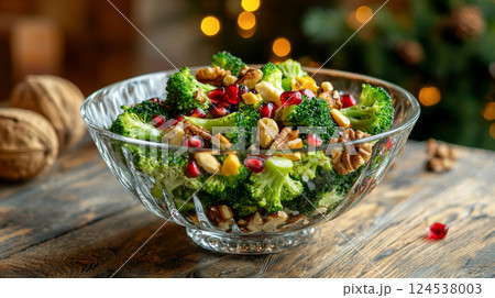 Festive christmas broccoli salad with pomegranate and nuts. concept of healthy holiday meal, vibrant nutrition, winter dining, vegetable vegetarian salad