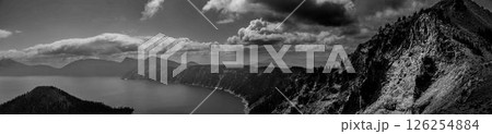 Panoramic view of Crater Lake and Wizard Island in Oregon