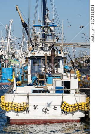 Modern fishing boat floating on water, featuring a crane with hook, red flag, lifebuoy, and navigation equipment, representing commercial fishing industry and maritime activities