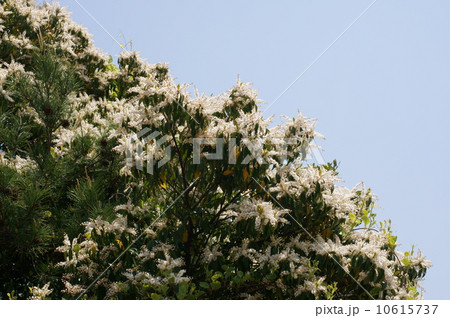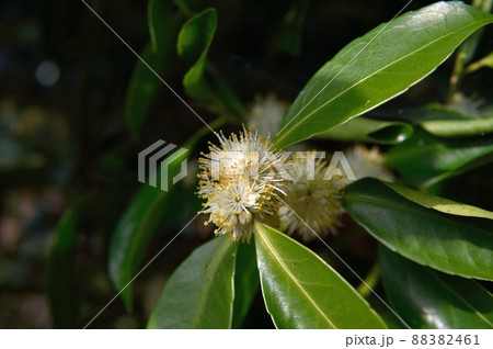 自然 植物 クロキ、三月中旬。満開の花、緑の葉の間から白いポンポンがたくさんのぞいています
