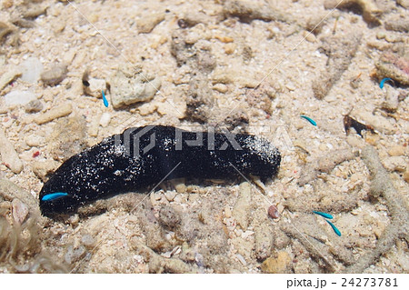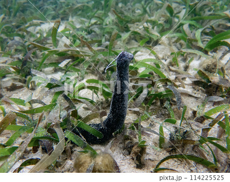 海草に住むクロナマコ(Holothuria atra)の産卵
