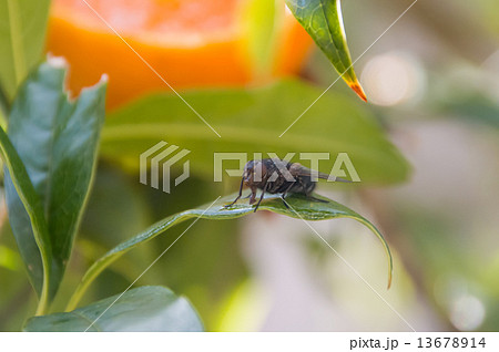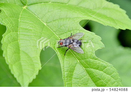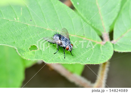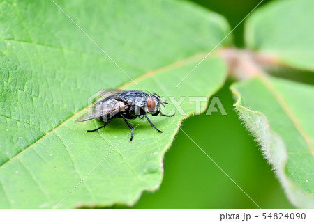 葉っぱに止まる蝿 ハエ クロバエ オビキンバエ 銀バエ