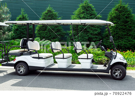 White electric car for transportation of passengers in the golf club on the background of a flower bed with evergreens and thuja, empty car with white seats and a canopy of sunlight.
