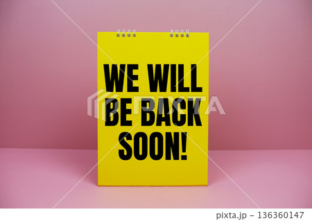 "We Will Be Back Soon!" displayed against a pink background