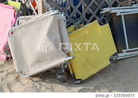 Beach equipment folded. Sunbeds on top of each other. Concept of the end of the beach season. Autumn at sea.
