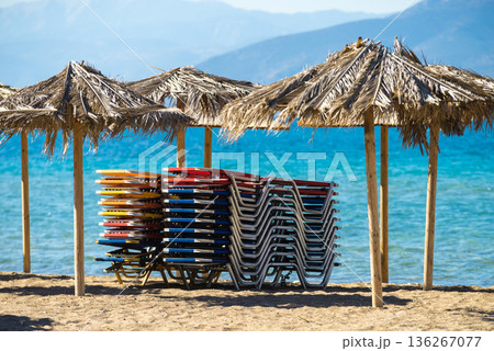 Empty beach loungers without people in start or the end of summer vacation season
