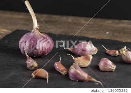 ripe purple garlic is scattered on a black table in the kitchen, garlic spices are on a black slate in the kitchen over cooking